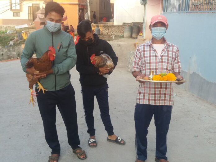मध्यपुर थिमि–१, लोकन्थलीस्थित सिद्धिकाली मन्दिरमा बली पुजा गर्न व्यस्त न्हुँछेबहादुर प्रजापतिले आसुरी शक्ति माथि दैवी शक्तिको जितको प्रतिकको रुपमा रहेको बडादशैं अर्थात मोहनी नखःमा