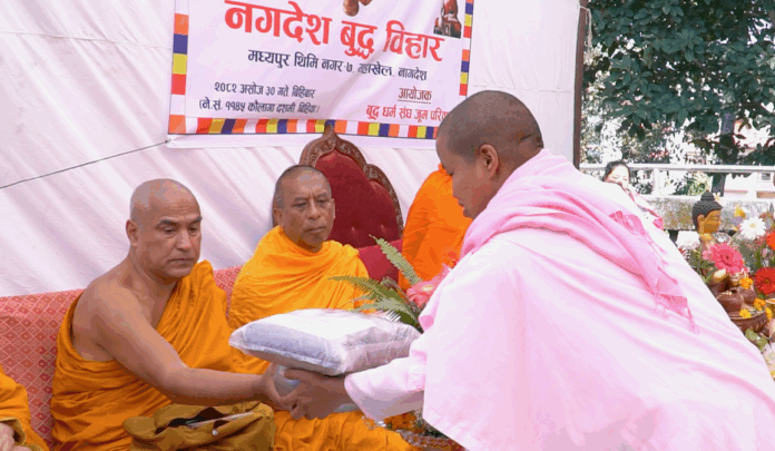 कार्यक्रमको सुरुवात कथिन चीवरको शोभायात्राबाट भएको थियो । शोभायात्रामा बाजागाजाका साथ उपासक उपासिकाहरूले विहारबाट नगदेशको लायकुसम्म परिक्रमा गरेका थिए। शोभायात्रा विहारमा पुगेपछि भिक्षु धर्मगुप्त महास्थविरले उपस्थित उपासक उपासिकाहरूलाई पञ्चशील प्रदान गर्नुभयो। त्यसपछि भिक्षु तपस्सिधम्म महास्थविरको नेतृत्वमा बुद्धपूजा गरिएको थियो।