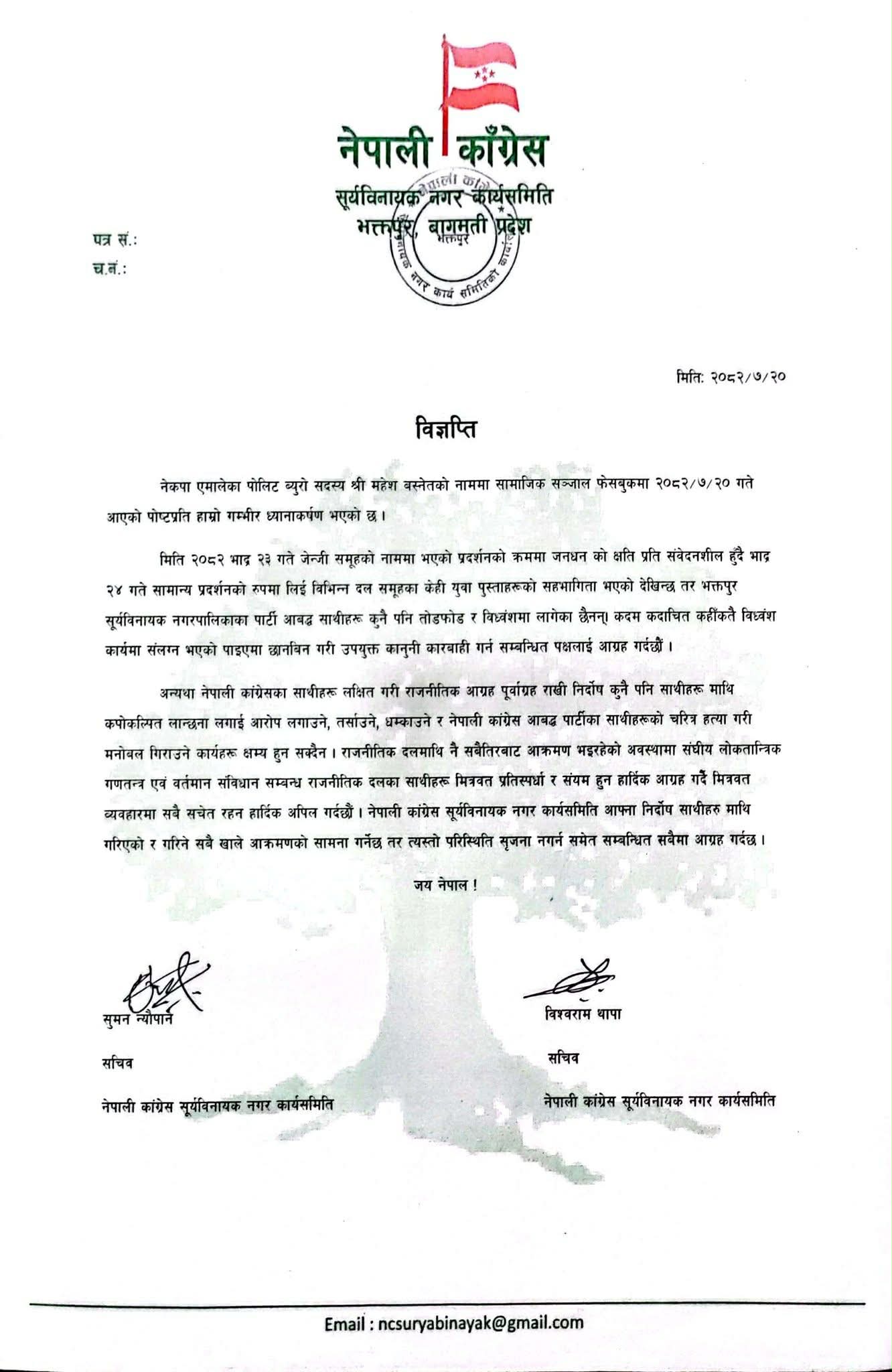 नेकपा एमालेका पोलिट्व्युरो सदस्य एवम् पुर्वमन्त्री महेश बस्नेतले बिहिवार सामाजिक सञ्जाल फेसबुकमा पोष्ट गरेको एउटा स्टाटस माथि नेपाली कांग्रेस सूर्यविनायक नगरसमितिले विज्ञप्ती जारी गर्दै आपत्ति जनाएको छ ।
