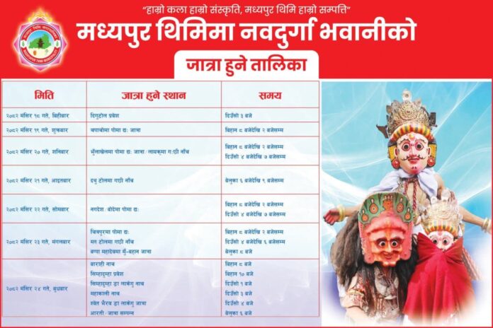 नवदुर्गा देवगणले एक सातासम्म मध्यपुर थिमिका विभिन्न स्थान टोलमा नाच प्रदर्शन गर्नुका साथै स्थानीयको पुजा थाप्ने गरिन्छ । नवदुर्गा देवगण मंसिर १८ गते दिउँसो मध्यपुर थिमिको दथुटोल प्रवेश गर्ने कार्यक्रम रहेको नगर प्रमुख सुरेन्द्र श्रेष्ठले जानकारी दिनुभयो ।