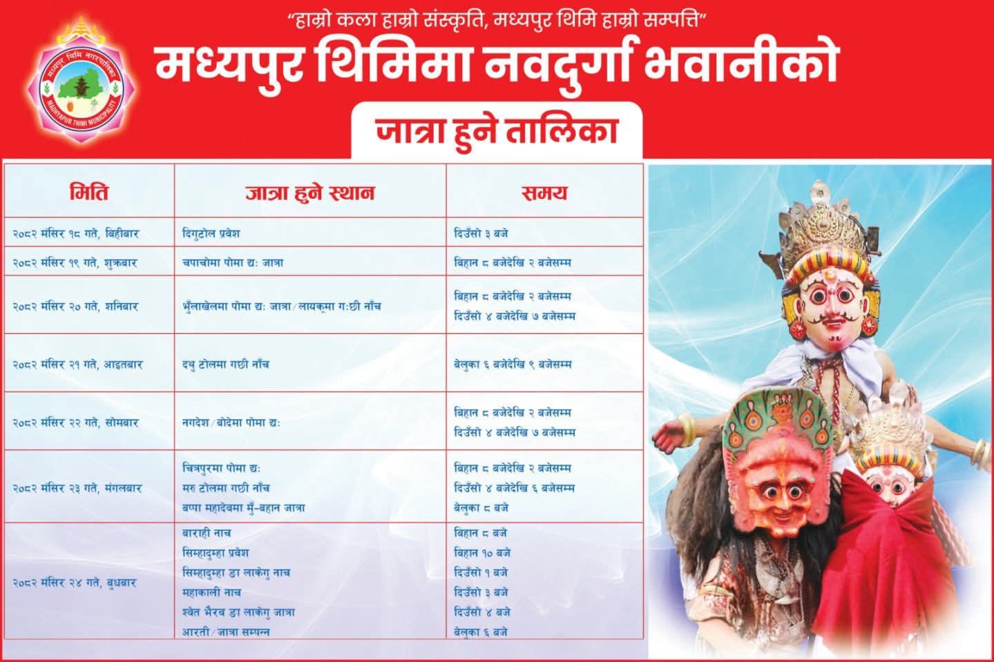 भक्तपुरको धार्मिक एवम् ऐतिहासिक महत्वको नवदुर्गा देवगण यही मंसिर १८ गतेदेखी एक हप्ता मध्यपुर थिमिमा रहने भएको छ । नवदुर्गा देवगणको परम्परा अनुसार विभिन्न शहरमा गएर जात्रा गर्नुपर्ने भएकाले यःमरी पुन्ही अर्थात धान्य पुर्णिमाको दिन मध्यपुर थिमि आउने भएको हो ।