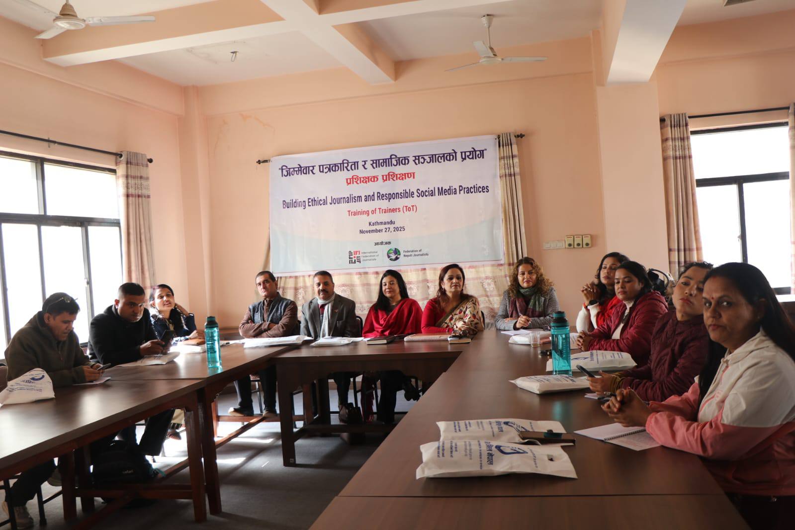 सामाजिक सञ्जालमा बढ्दो मिथ्या सूचना र सञ्चारमाध्यमको विश्वसनीयतामाथि प्रश्न उठिरहेको बेला अन्तर्राष्ट्रिय पत्रकार महासंघ र नेपाल पत्रकार महासंघले ‘जिम्मेवार पत्रकारिता र सामाजिक सञ्चालको प्रयोग’ विषयक एकदिने प्रशिक्षक प्रशिक्षण तालिम आयोजना गरेको छ । तालिममा महासंघ केन्द्रीय समितिका पदाधिकारी तथा सदस्य गरी २५ जना सहभागी थिए ।