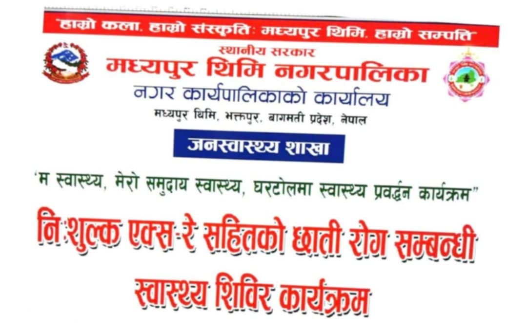 मध्यपुर थिमि नगरपालिकाले नगरबासीको घरदैलोमा एआइ एक्स–रे सहितको छाती रोग सम्बन्धी निःशुल्क स्वास्थ्य शिविर सञ्चालन गर्ने भएको छ । नगरपालिकाले ‘म स्वस्थ, मेरो समुदाय स्वस्थ, घर टोलमा स्वास्थ प्रबद्र्धन कार्यक्रम’ अन्तर्गत शिविर सञ्चालन गर्न लागेको हो ।